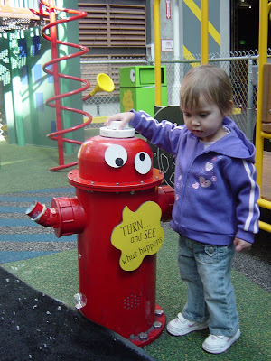 Checking out the fire hydrant. Not a standard fire hydrant mind you. If you turn the top, it blows bubbles! Ainsley finally got the hang of it and we ended up a bubbly mess before leaving this exhibit.