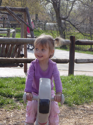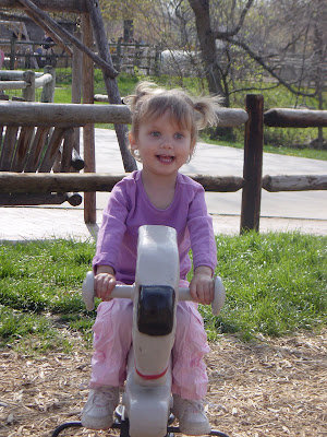 I was too small to ride the real ponies. I have to be three to do that. I've steadily been saying "I'm too tiny to ride horsey. I need to grow big." Since our visit. Mom found a decent stand in though at the playground there.